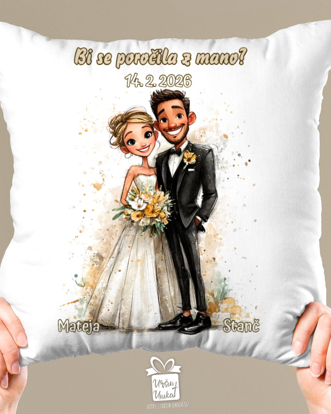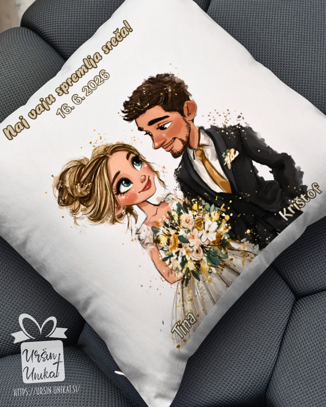 POROČNA BLAZINA - z napisom in ilustracijo po želji POROČNO DARILO ali DARILO ZA VALENTINOVO/OBLETNICO - z napisom po želji